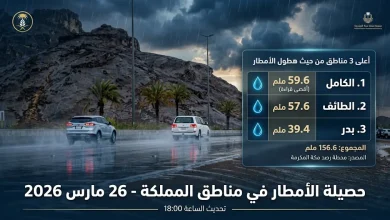 كشف التقرير اليومي الصادر عن وزارة البيئة والمياه والزراعة، اليوم الخميس 26 مارس 2026، عن تفاصيل الحالة المطرية التي شهدتها…