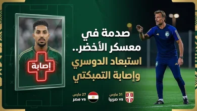 تطورات طبية في معسكر الأخضر تشمل استبعاد سالم الدوسري وإصابة التمبكتي قبل مواجهتي مصر وصربيا