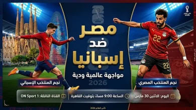 القنوات الناقلة لمباراة مصر وإسبانيا اليوم الاثنين 30-3-2026 وتردد قناة أون سبورت