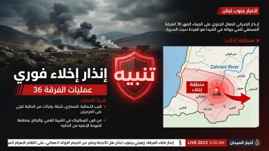 إنذار إخلاء عاجل لسكان جنوب نهر الزهراني وعمليات عسكرية مكثفة للفرقة 36 في لبنان