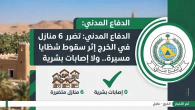تضرر 6 منازل في الخرج إثر سقوط شظايا طائرة مسيرة والدفاع المدني يؤكد استقرار الأوضاع