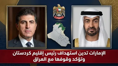محمد بن زايد يدين الهجوم الإرهابي على مقر إقامة نيجيرفان بارزاني ويؤكد دعم الإمارات لأمن العراق